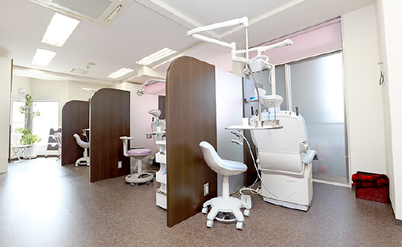 広い治療スペースは、パーティションで仕切られており、安心です。ゆったりと診療を受けることができる半個室の治療スペースもございます。